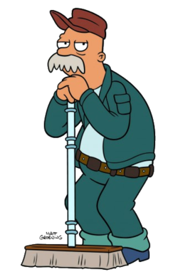 He is the Planet Express janitor. A recurring joke is that because he interacts so little with the rest of the employees, nobody remembers ever seeing him before. It has been revealed that he owns 40,000 shares of Planet Express, more than anyone else, because he strongly believes in the company. He is lazy and can usually be found in the basement of the building, watching the boiler and reading an edition of Zero-G Juggs or National Pornographic. He almost always refers to himself in the third person. He seems to be quite profound, such as questioning whether violence really solves anything after killing a fly.